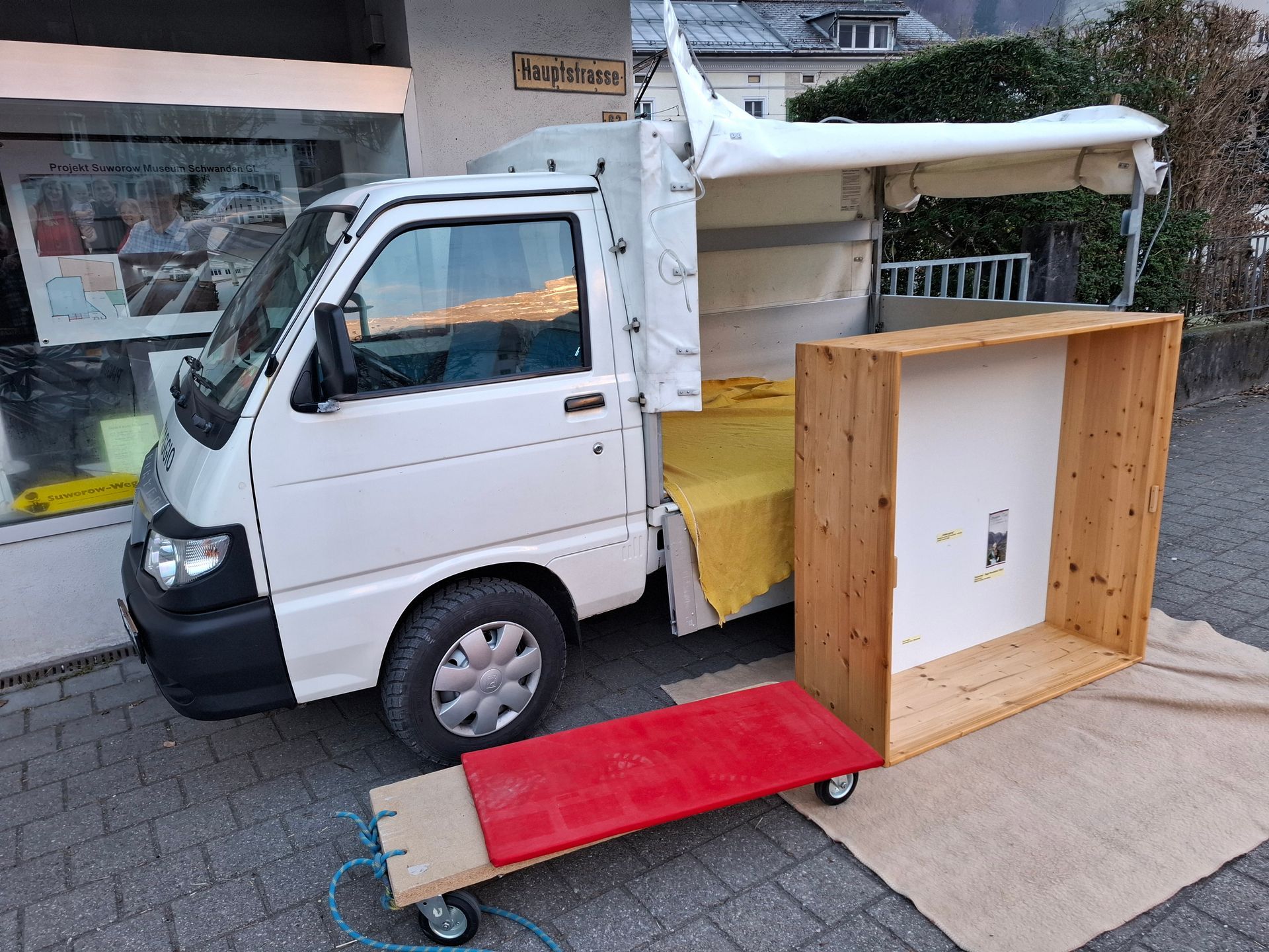 Im neuen Museum in Schwanden wurde diese Woche im Hauptraum, ein neuer Bodenbelag gemacht, daher war der Raum für weitere Arbeiten gesperrt. Heute wurden die Objekte, welche ein grosses Auto benötigen, von Altdorf nach Schwanden transportiert. Der Auftrag wurde zu unserer grössten Zufriedenheit von zwei Transporteuren erledigt. Die Kosten wurden ebenso privat übernommen, so dass der Umzug bisher dem Museum keine Kosten verursacht hat.