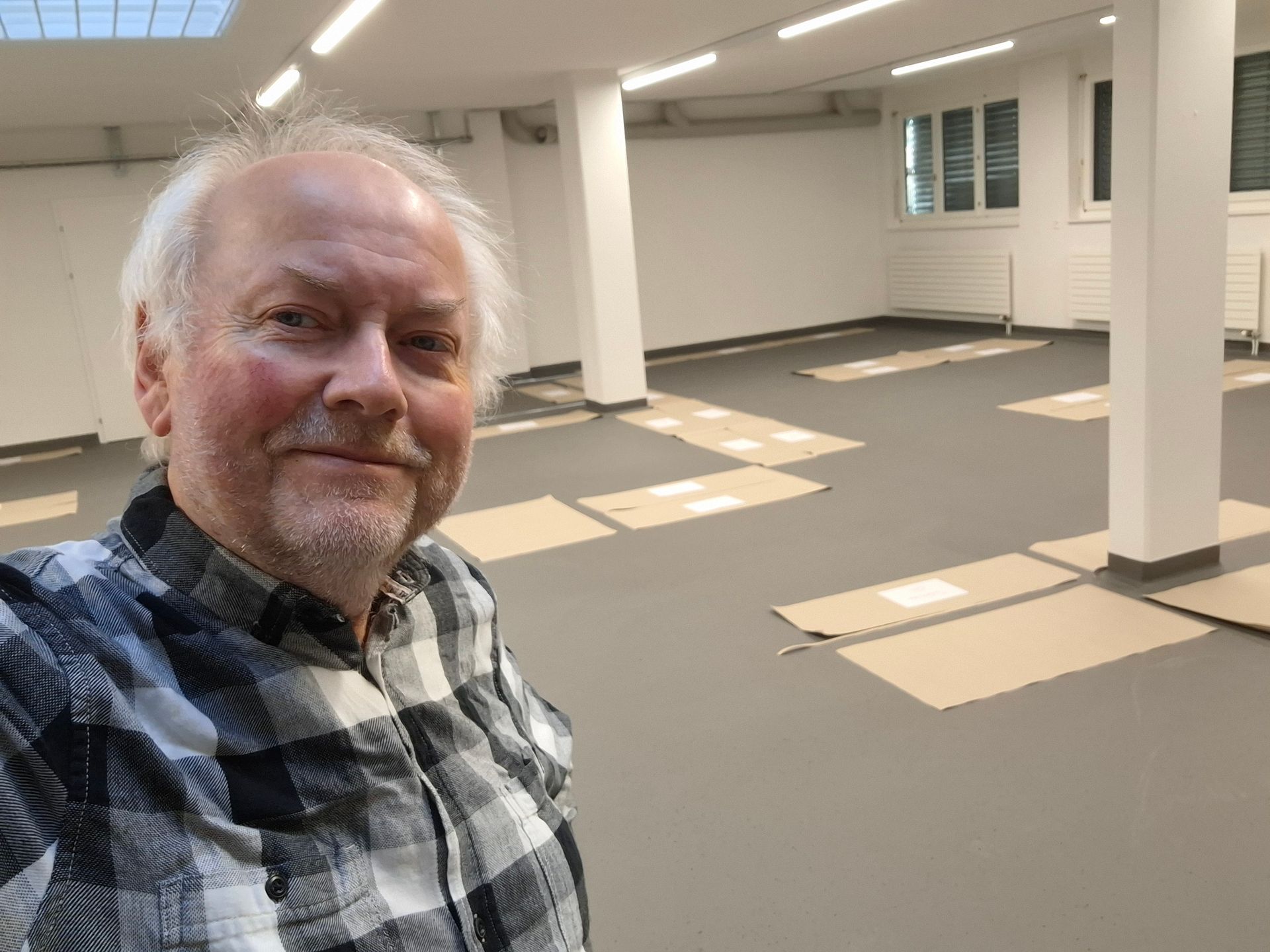 Nachtschicht im Suworow Archiv Schwanden. Damit durch das einlagern der Vitrinen keine Schäden am Boden entstehen, habe ich den Boden mit Flies abgedeckt. Der Bodenschutz kommt wieder weg, sobald die Räume bei der Post bezugsbereit sind. Danach ist hier das Museums Archiv und das Büro. Das Schaufenster bewirbt das neue Museum.