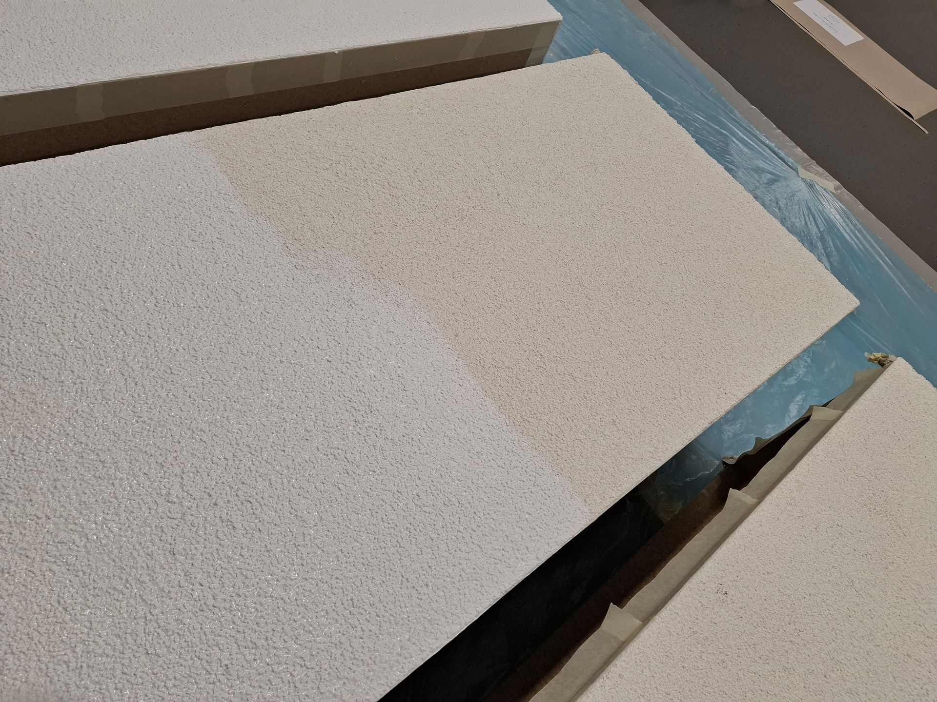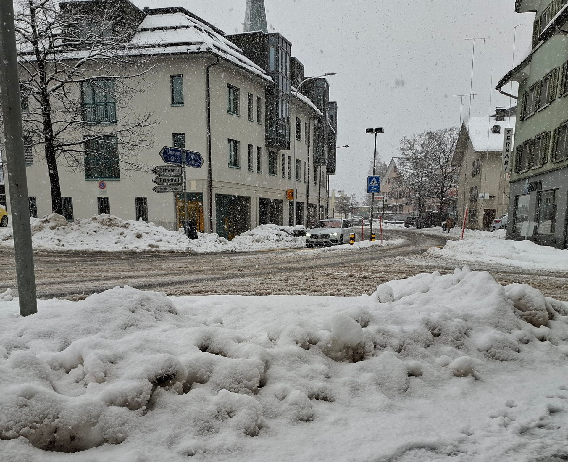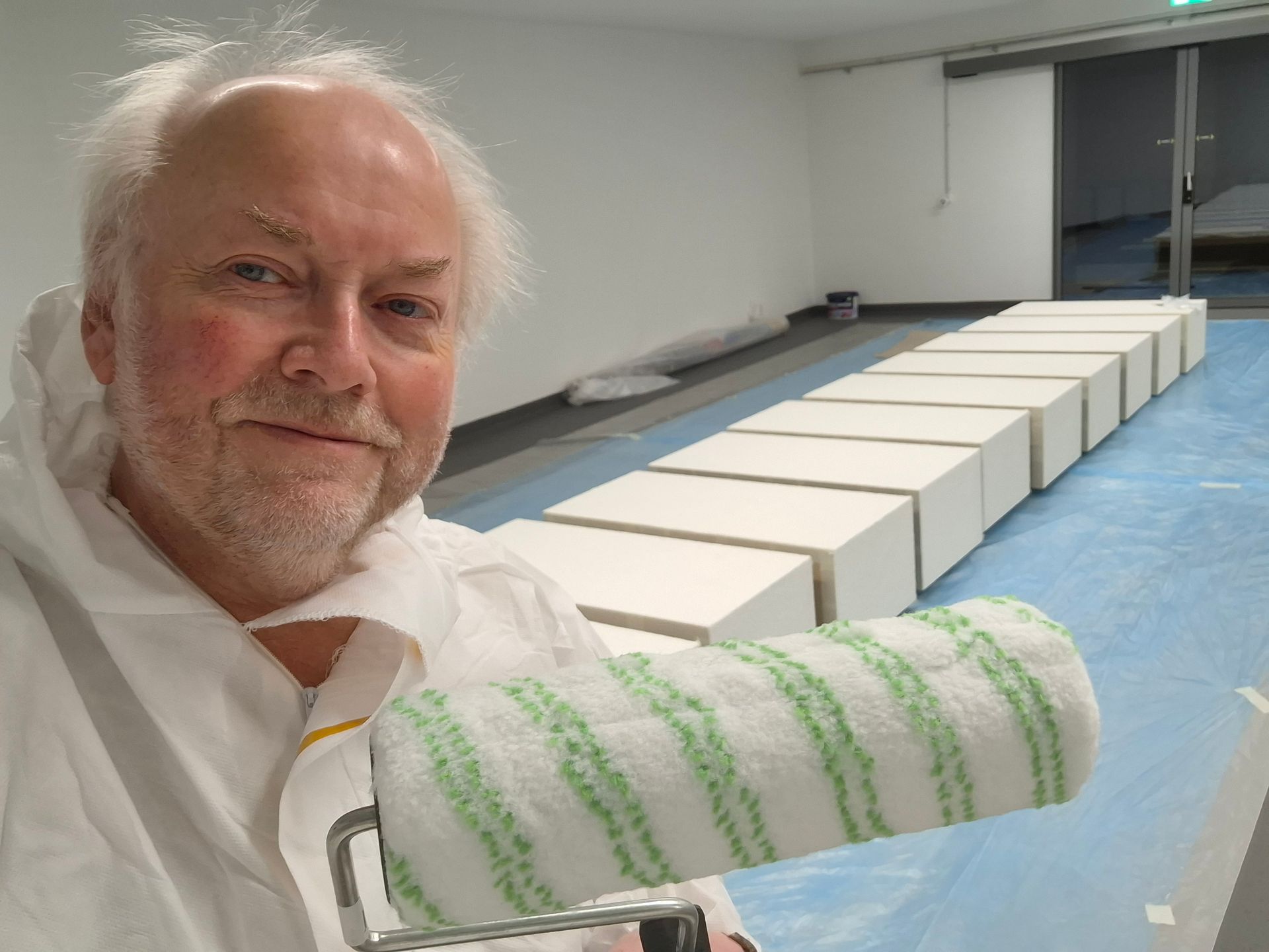 Es schneit! Somit können keine Vitrinen ins neue Museum transportiert werden. Darum habe ich mit der Revovation der schon vorhandenen Sockel begonnen. Alles ist so organisiert, dass ich die Arbeit alleine erledigen kann. Das streichen mit dem Farbroller macht Spass, das vorherige abkleben weniger. Die sind doch noch schön - warum streichst du die trotzdem, wurde ich gefragt? Auf dem Einzelfoto könnt Ihr den Unterschied sehen. Der Museumsraum ist ganz neu renoviert, da müssen auch die Sockel gestrichen werden. Später geht das nicht mehr.