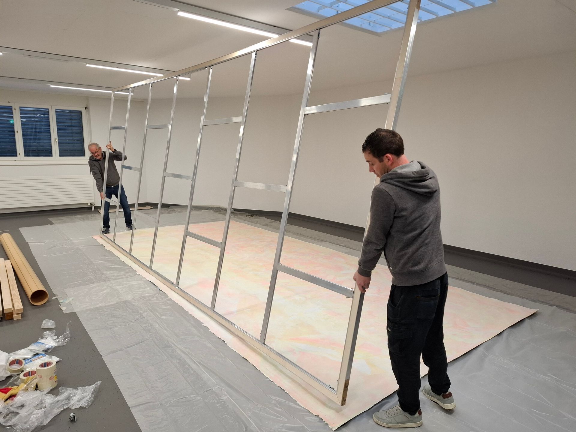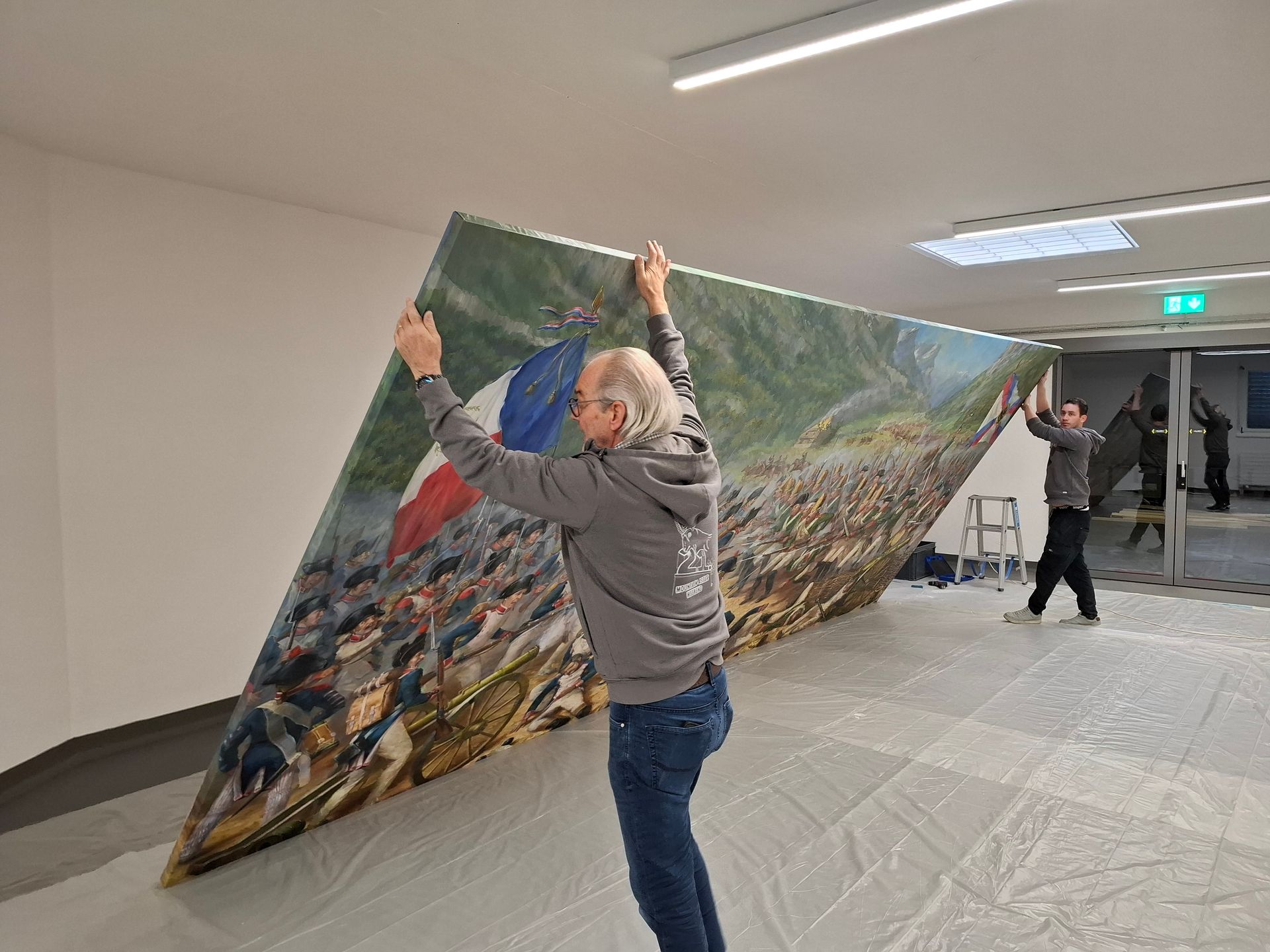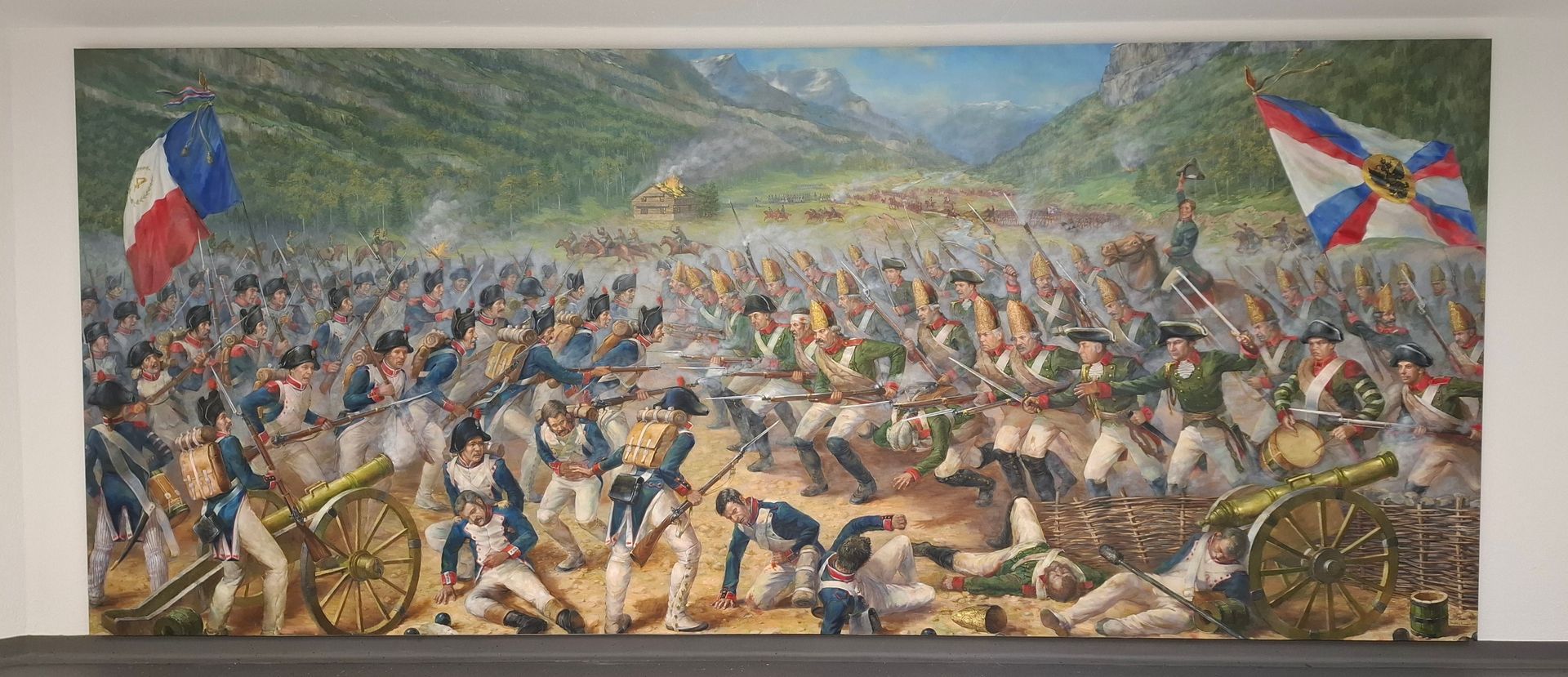 Ukrainisches Geschenk im Suworow Museum Schwanden GL wieder ausgestellt. Im Jahre 2011 beauftragte der Suworow Mäzen, Boris Poljakov aus Kiew, die ukrainischen Künstler Fjodor Ivanitzki und Veronika Chamaiko für das damalige Suworow Museum in Linthal ein grossartiges Gemälde zu schaffen. Beim Umzug nach Altdorf war jedoch kein Platz mehr vorhanden. Wir hatten diese Leihgabe zurückgegeben. 2022 ergab sich die Möglichkeit das Museum zu vergrössern, so haben wir das Bild der Schlacht bei Muotathal als Geschenk erhalten. Als erstes Objekt im neuen Museum in Schwanden GL, wurde das Gemälde vom Studio Arte, Zürich auf Alu-Keilrahmen aufgezogen und montiert. Die jetzt entstandenen Kosten wurden aus unserem Baufonds der Familie Amstad aus Brunnen getragen.