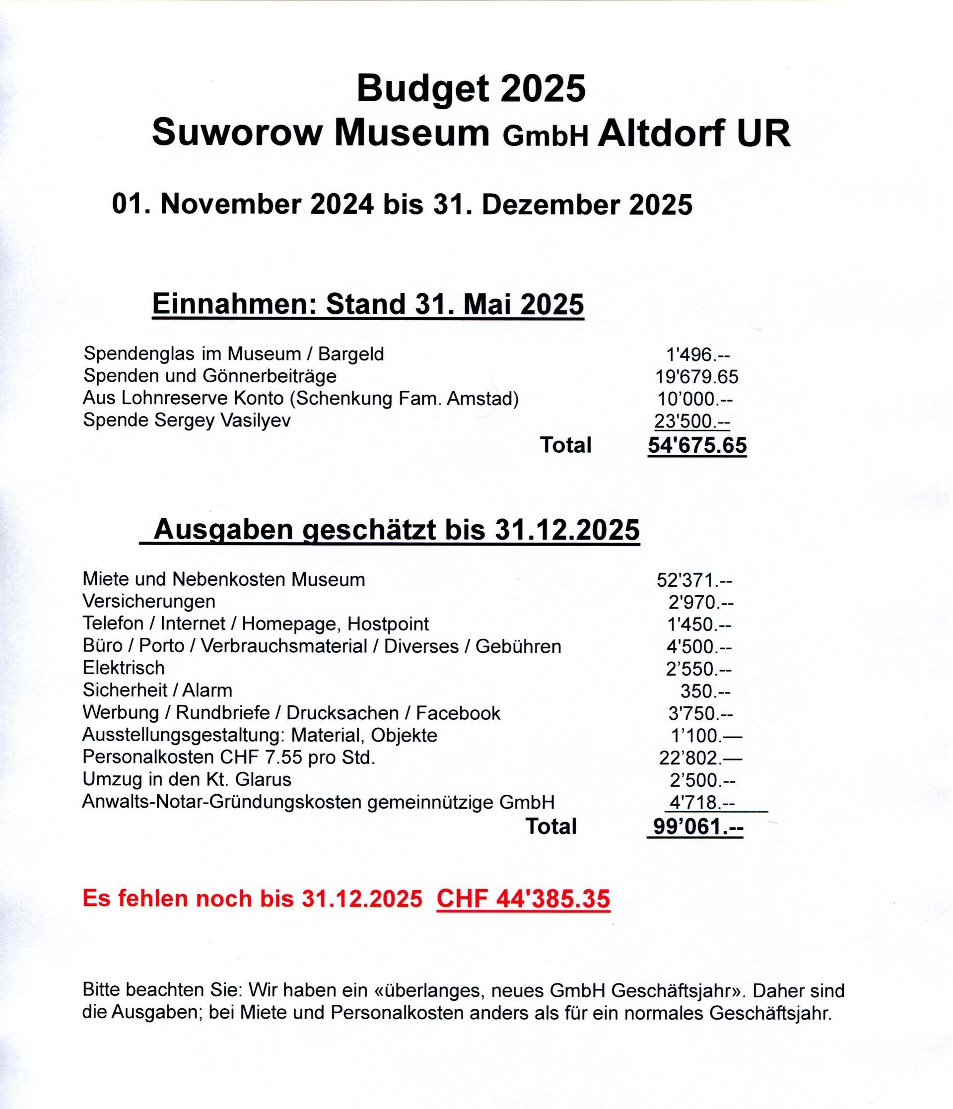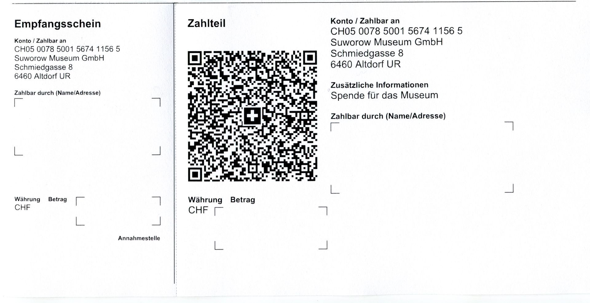 Вы можете оказать помощь в размере 5 швейцарских франков - (или более) на поддержание существования и дальнейшее развитие музея.